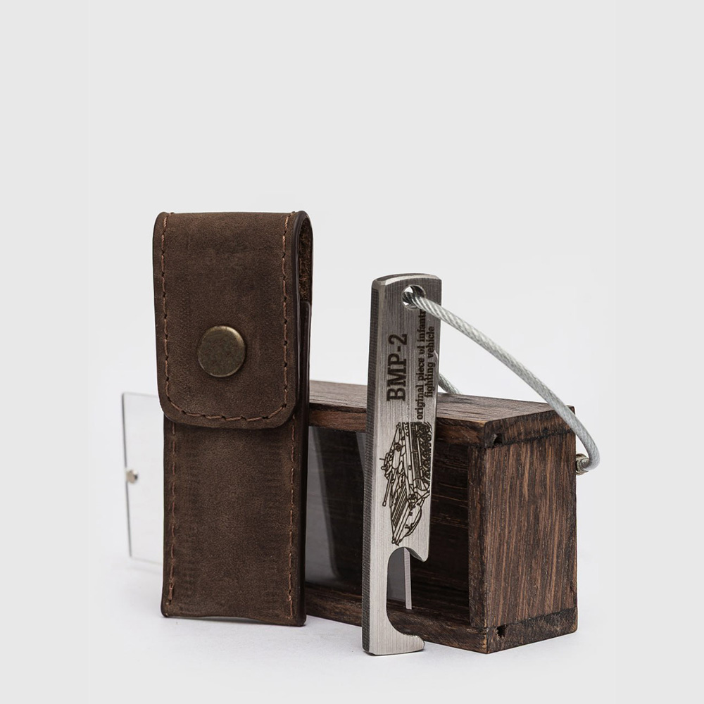 ▪ The keychain is shaped as a convenient bottle opener and comes with a leather case and wooden storage box.