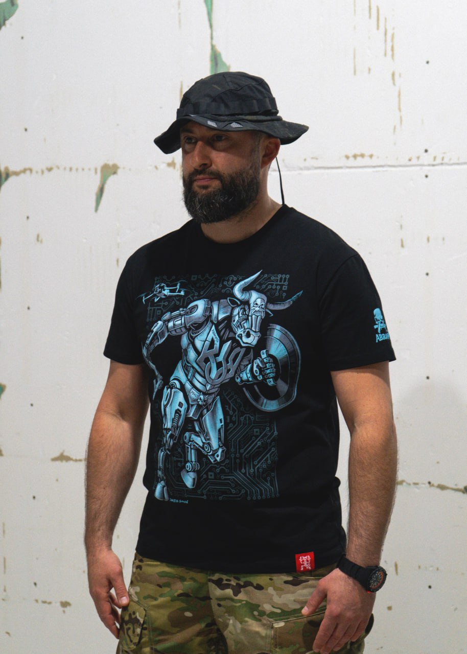 The unique illustration created by Ukrainian artist Roman Shostya depicts a combat cyberbull - a symbol of control over machines, confidence in one's own business, and uncompromising technical superiority. Its horns, drone in the sky, digital background and combat exoskeleton are all about you if your front is technology.