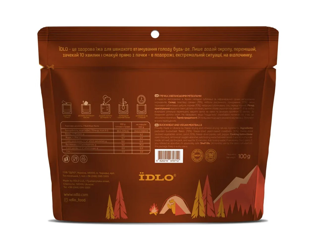 ▪ Ingredients: buckwheat flakes (76%), plant-based meatballs (10%), freeze-dried stewed vegetables (onion, carrot — 10%), tomato paste, freeze-dried parsley, salt, black pepper