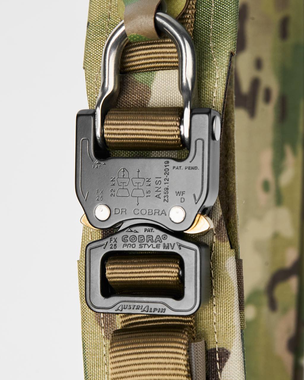 ▪ 27 mm Cobra metal buckle with D-ring — fast and reliable fastening, compatible with safety harness systems.