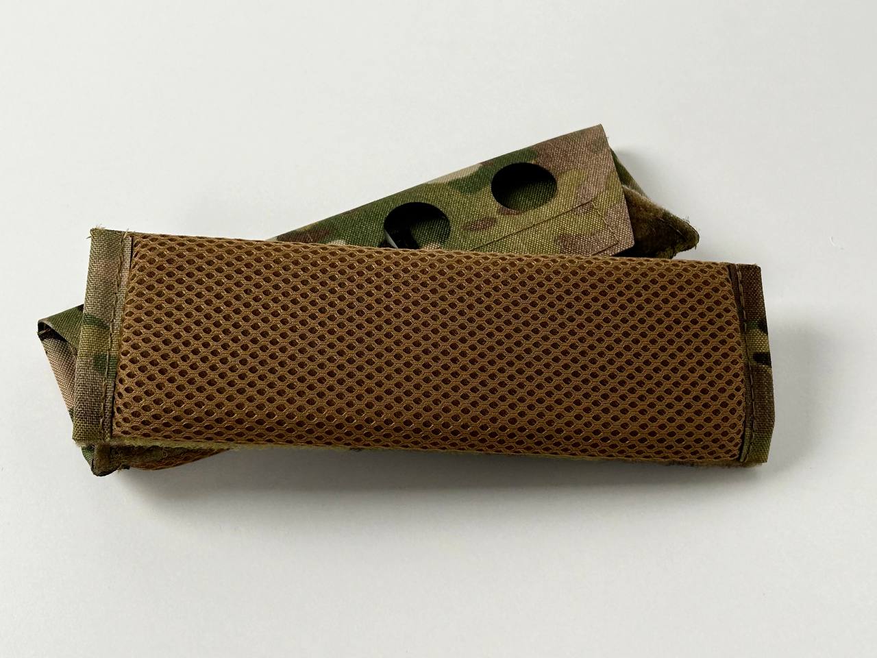These pads reduce the feeling of heaviness and distribute the load over the body. Made of laser-cut laminate with 1/4" foam and 3mm spacer mesh against the user's body. Velcro attaches to the straps, which have velcro on the underside.
