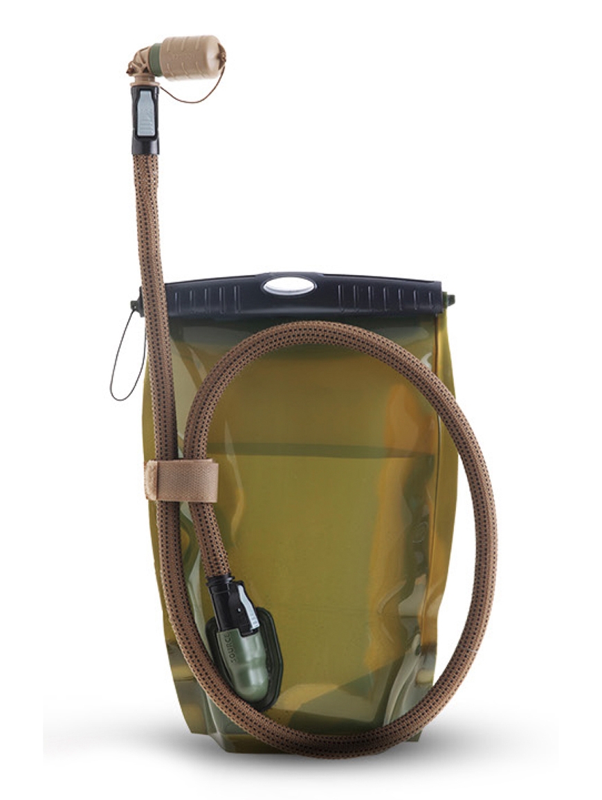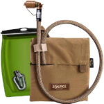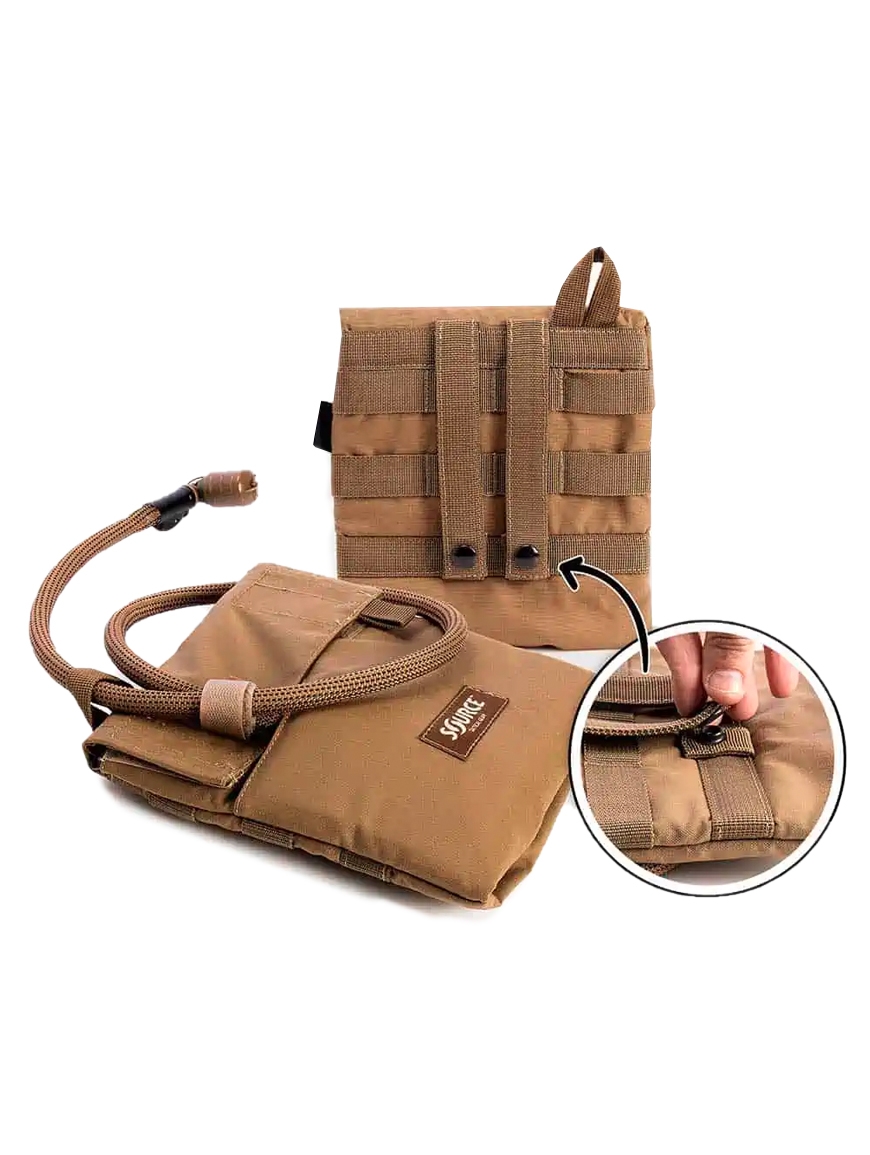 Hydration system compatible with Kangaroo Hydration System for attachment to a vest or combat belt using MOLLE webbing.