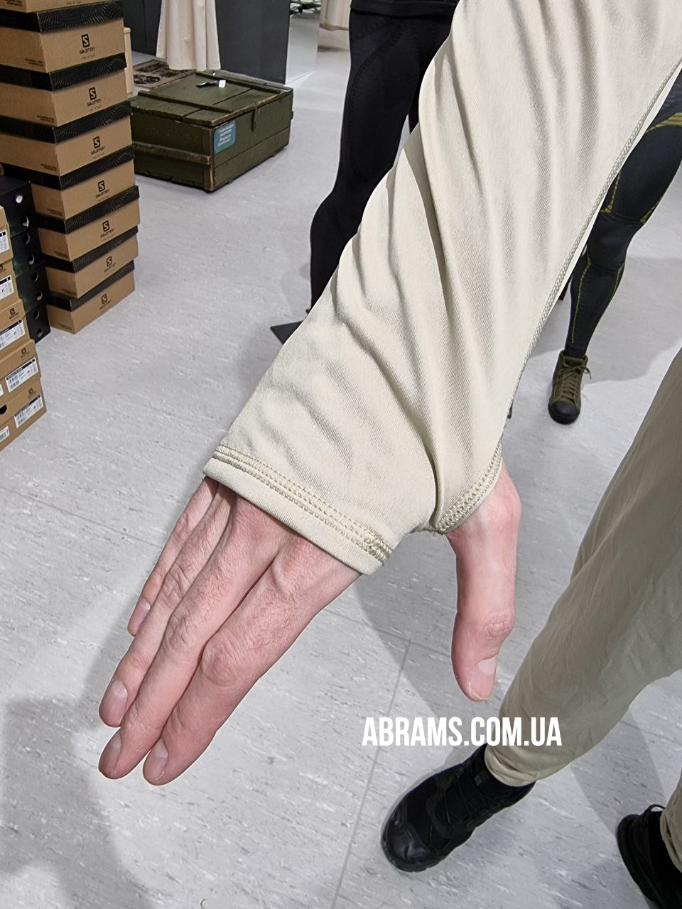 - an additional hole on the sleeve for the thumb, which makes it easier to put on additional layers of clothing (for example, ECWCS Gen 3 Level 2) and can serve as protection for the back of the hand from wind or cold;